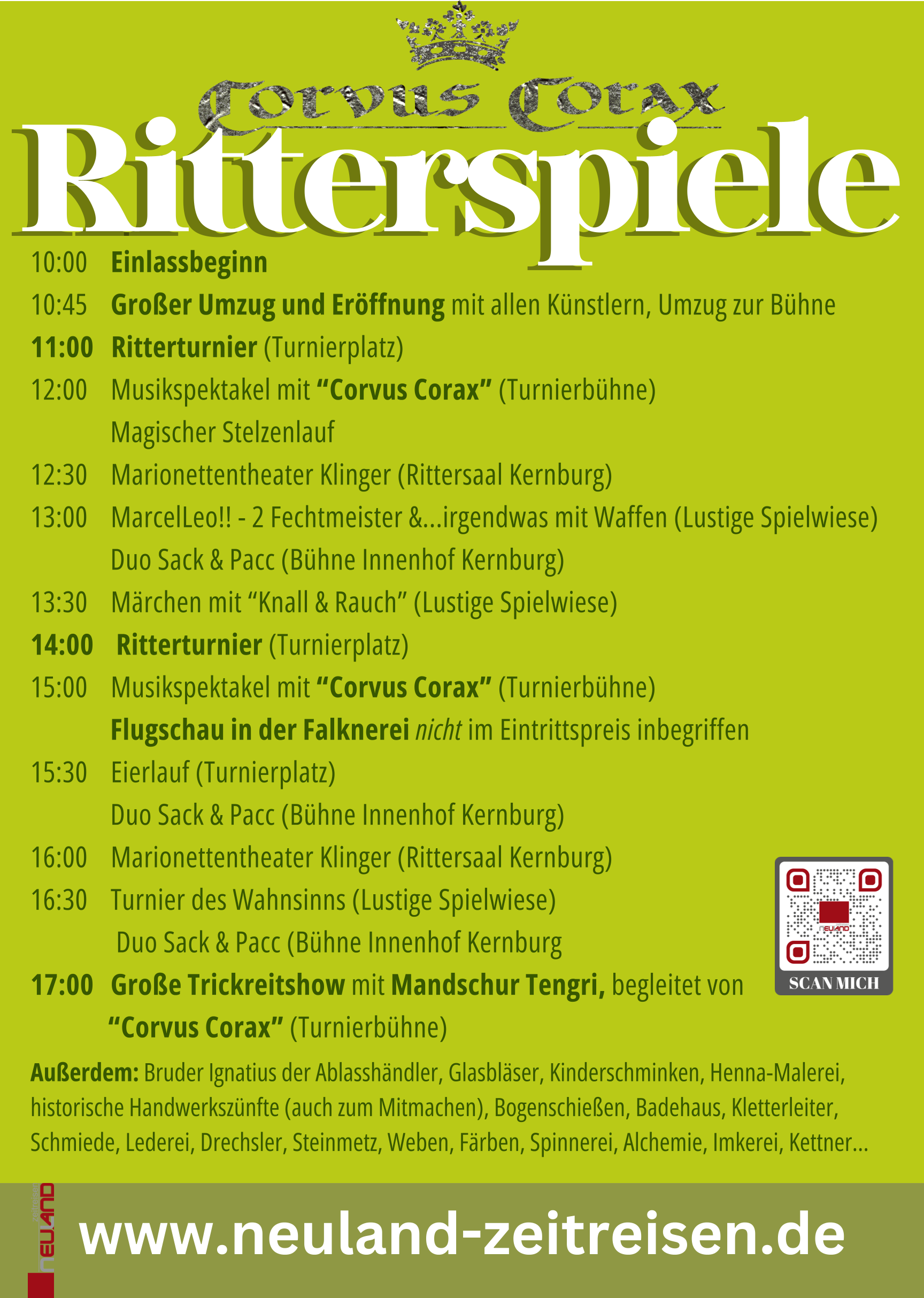 Besonderes Highlight: zugesagt haben in diesem Jahr die spektakulären Könige der Spielleute - CORVUS CORAX. Dreimal täglich könnt ihr Treibende Rhythmen, althergebrachte Melodien und der Klang alter Zeiten genießen: mit faszinierend großen Trommeln und selbstgebauten Dudelsäcken lassen Corvus Corax die Stimmungen alter Zeiten aufleben.
